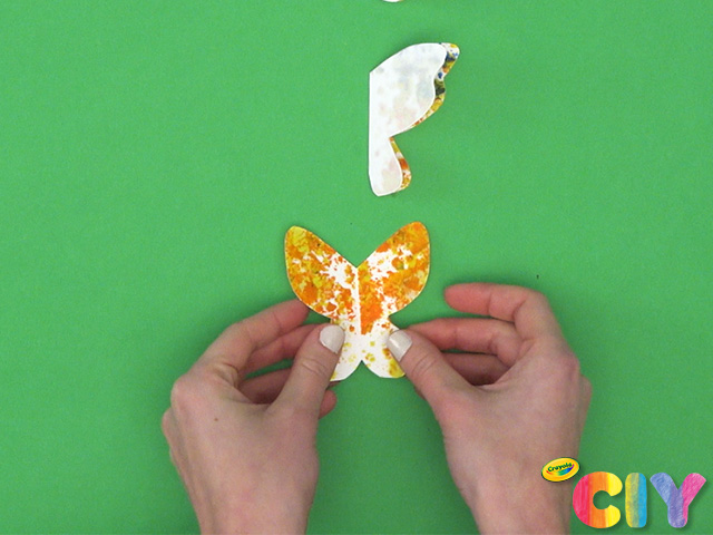 Have an adult iron parchment paper on low heat for 1 minute. Cool 15 minutes. Cut out butterflies and unfold.