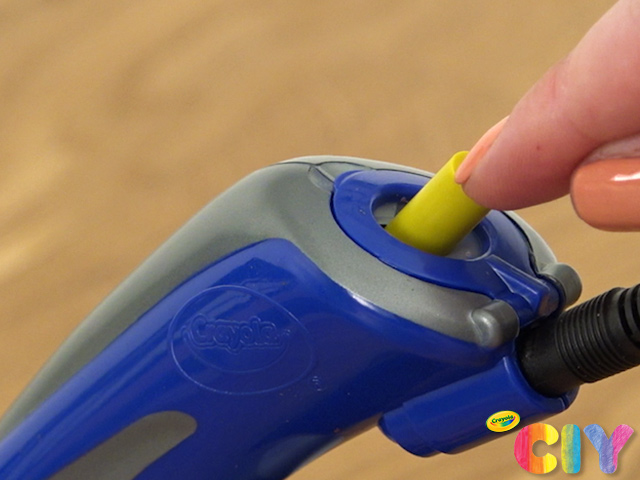 Load 2–3 crayon pieces of your desired color(s) into top of Crayon Melter unit.
