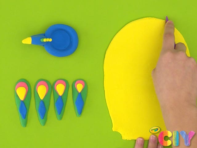 Press crown, feathers, beak, and rim against peacock head and body to connect. Let all Model Magic dry overnight.