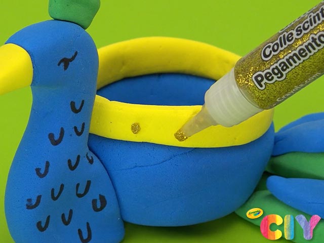 Use clay and dough tools to shape Model Magic crown, feathers, beak, and rim for top of bowl.