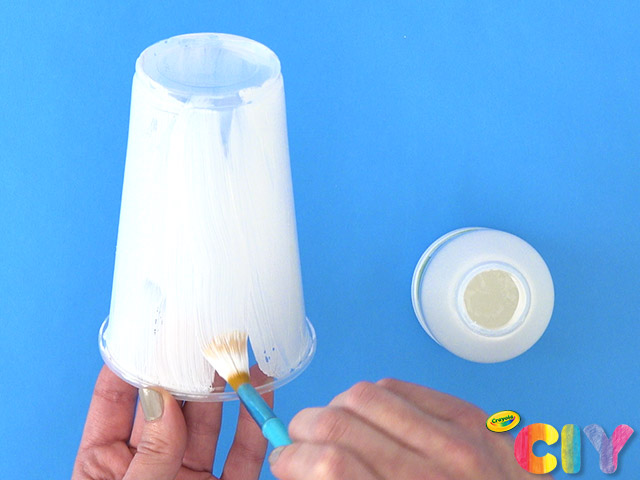 Cover cup with white paint. Dry 1–2 hours. Add a second coat. Dry 1–2 hours.