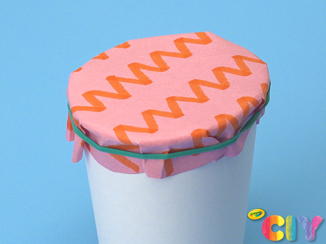 Center construction paper circle on top of cup and wrap rubber band around to secure.