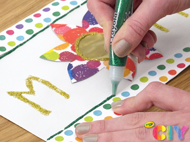 Take glitter glue tube and write out “MOM,” outlining the center circle of the flower to be the “O” letter.