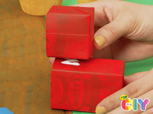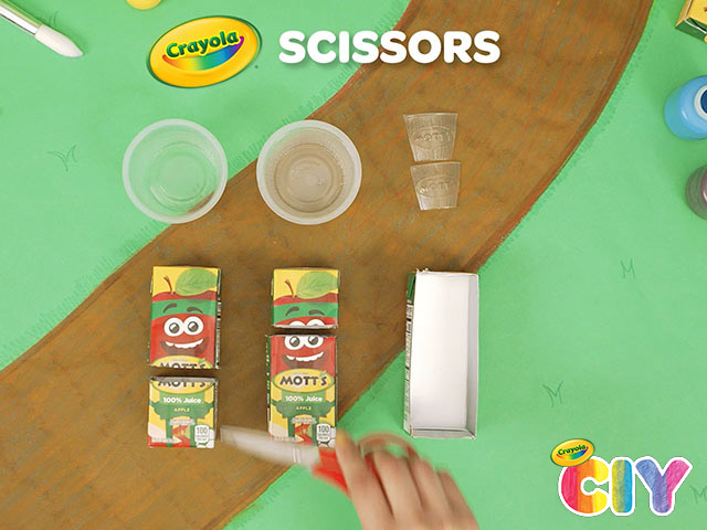 Cut 4 Mott’s apple juice straws and glue 2 pieces to each side of the brown box.
