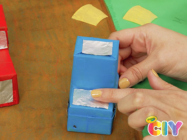 Add windows and grill with silver side of Mott's applesauce foil lid.