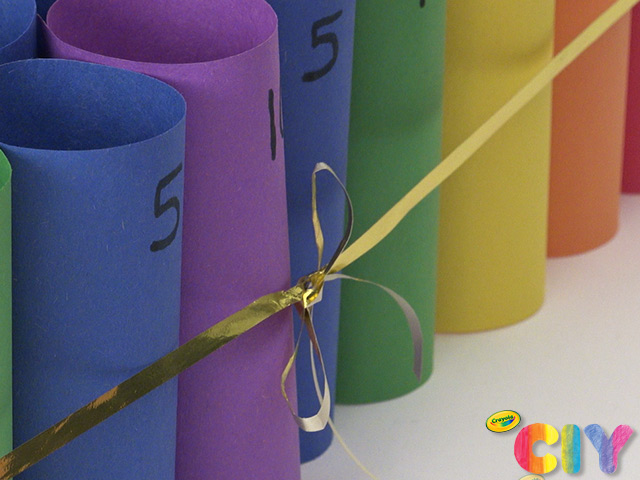 Repeat for a total of 16 red tubes, 13 orange tubes, 10 yellow tubes, 7 green tubes, 4 blue tubes, and 1 purple tube.