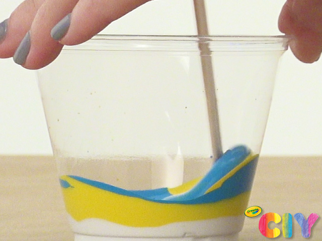 With a craft stick, mix together white, yellow, and blue acrylic paint in disposable cup.