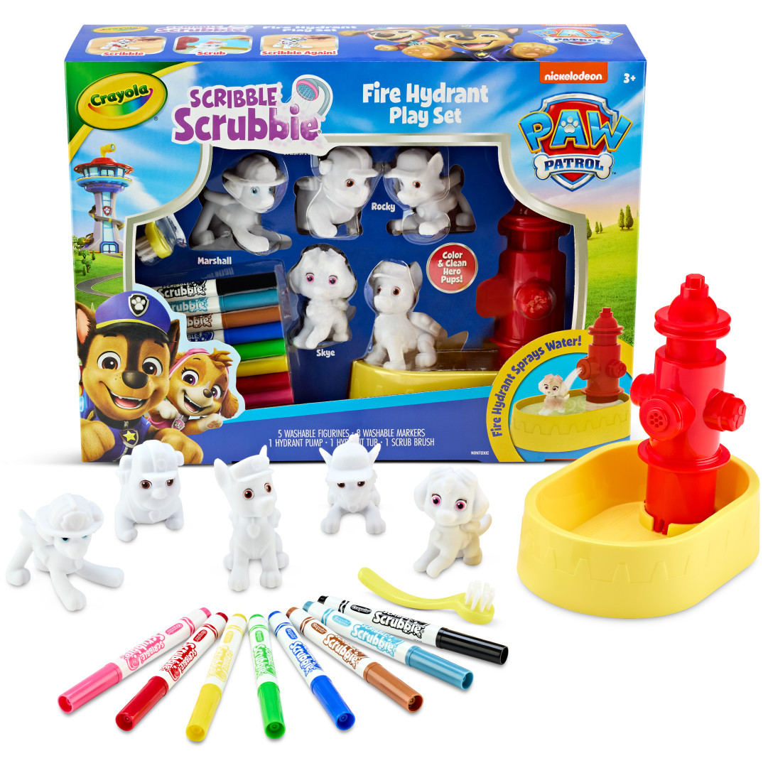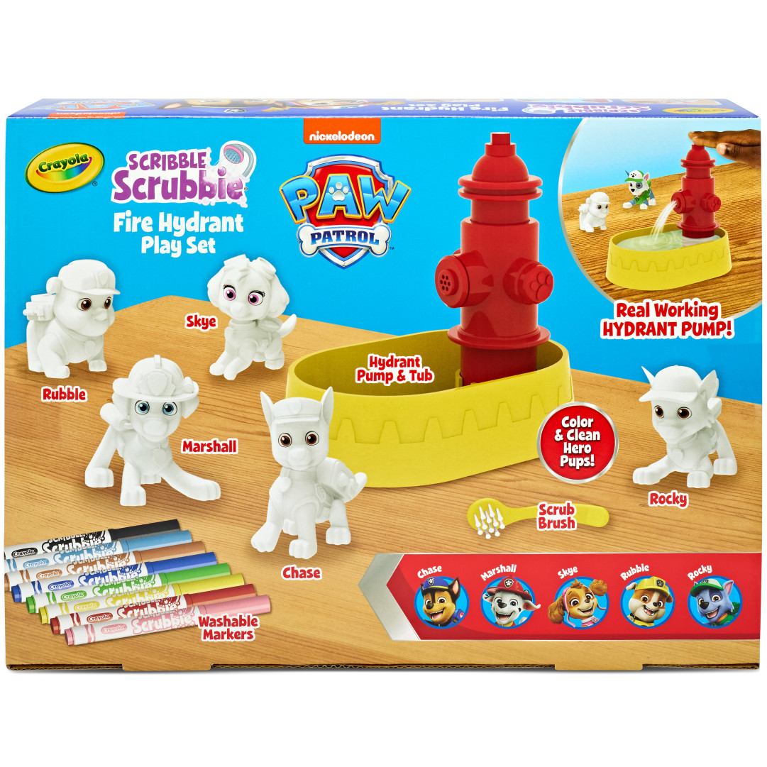 • Embark on a daring creative rescue with the Crayola Scribble Scrubbie Pets PAW Patrol set! Meet five brave Scribble Scrubbie Pets from the PAW Patrol team, ready for your artistic touch. Use eight washable markers to design bold looks for your pets. When it's time for a new mission, the real-working mini fire hydrant and scrub brush wash away the day's fun, prepping your pets for fresh creativity. Expand your rescue team with additional Scribble Scrubbie Pets (sold separately). This nontoxic set is perfect for young PAW Patrol fans aged 3 and up. Let the rescue missions begin!