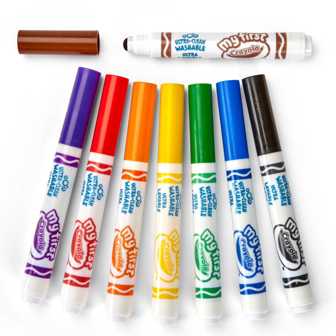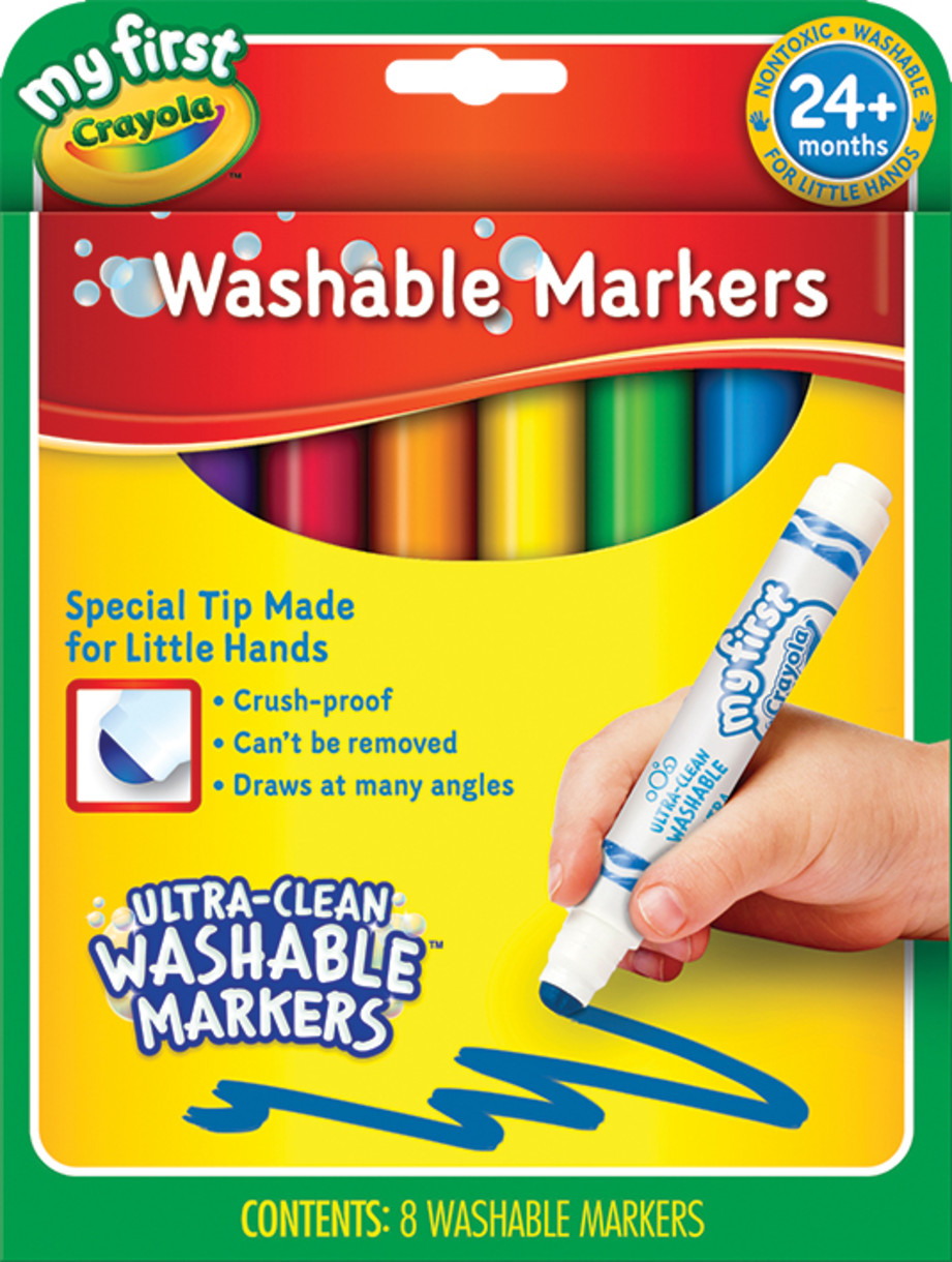 • These Crayola My First Washable Markers are bright, fun markers than can draw at any angle thanks to the rounded tip. These markers have a washable ink that can be easily cleaned off skin, clothes and walls. They're made with a special lid that is crush-proof and cannot be removed by children.