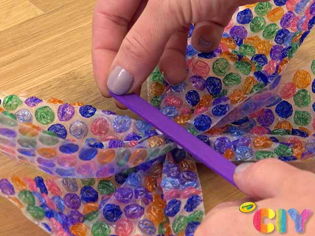 Pinch pieces of bubble wrap together at center points. Wrap fishing line around bubble wrap and tie to secure.