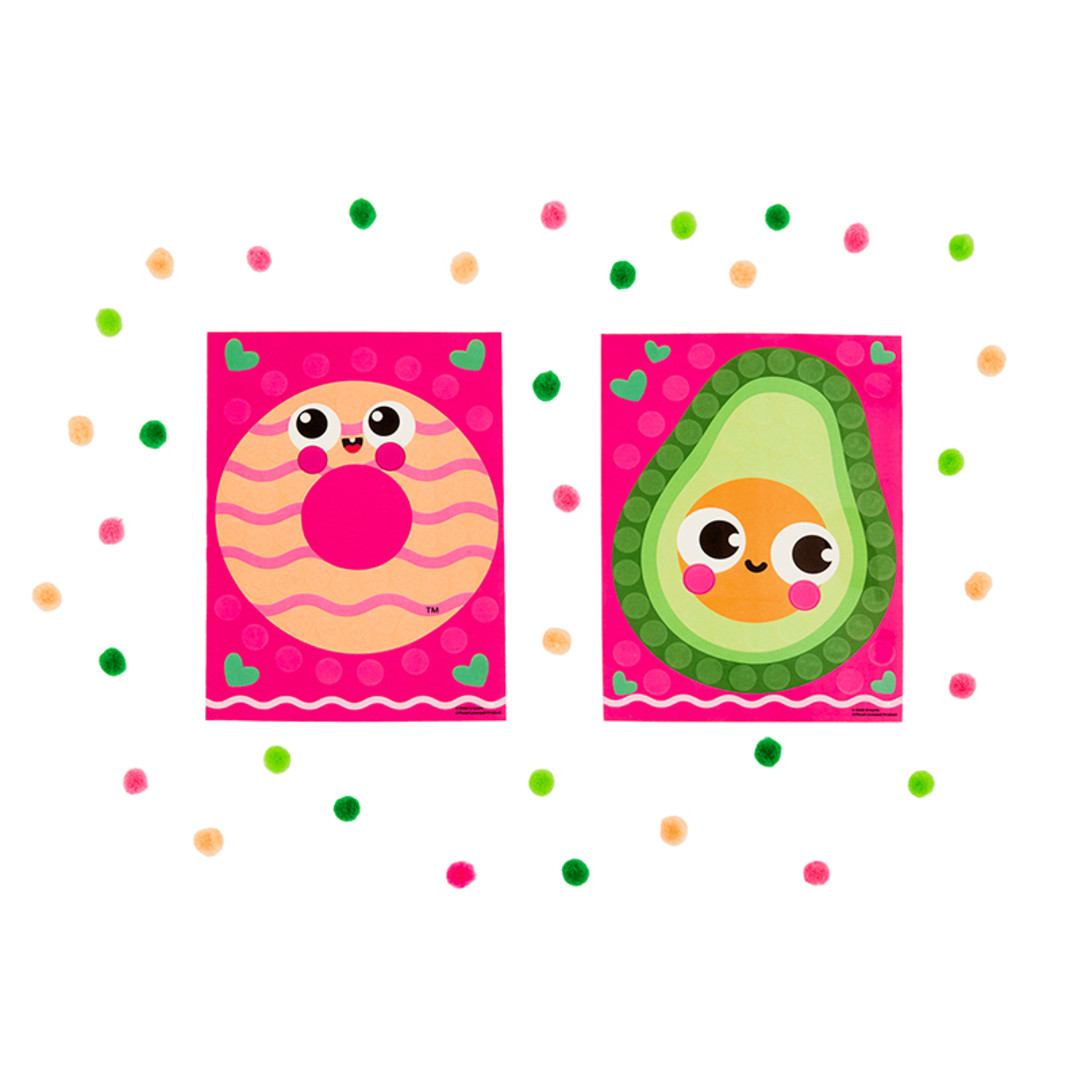 • Mini Set per creare e completare coloratissimi e morbidi personaggini foodie con i mini pompon. Facile e divertente: basta solo applicare i pompon negli appositi spazi seguendo i colori. Le scenette sono già dotate di adesivo, non occorre la colla! I personaggi (1 donut e 1 avocado) possono essere poi incollati al quaderno, diario, biglietto o essere utilizzati per decorare qualsiasi cosa suggerisca la fantasia.