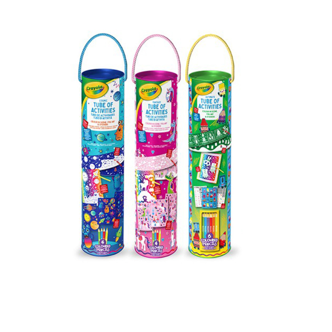 • 3 DIVERSE TEMATICHE: Coloratissimi e divertenti tubi portatutto che includono strumenti creativi in 3 diverse tematiche – spazio, creature mitiche e creatività Crayola!