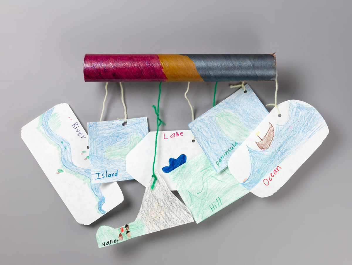 Ask students to decorate a paper towel tube and place holes along the length of the tube into which they'll tie each landform cut-out.