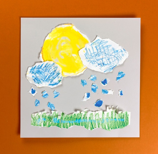 Have children create a torn paper collage that depicts a weather event. They might want to color pieces of paper bluish gray, crumple them up, and then flatten them to represent storm clouds. They could use wispy paper strips to represent wind.