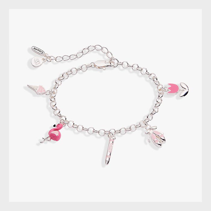 The Tickle Me Pink bracelet celebrates all things pink and fun. From a cheerful flamingo and twirly ballet slippers to a sweet ice cream cone, sharpened pencil, and blooming tulip, each charm tells its own colorful story. Perfect for expressing your playful personality and love of iconic Crayola colors.