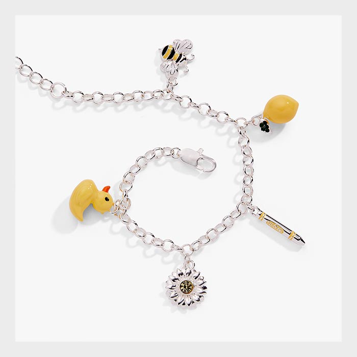 The Sunglow bracelet showcases five whimsical charms—a cheerful rubber duck, crystal-studded sunflower, vibrant crayon, sunny lemon, and adorable bee—each featuring dimensional details and enamel finishes. Inspired by the joy of creative expression, this playful piece captures the magic of imagination and childhood wonder.